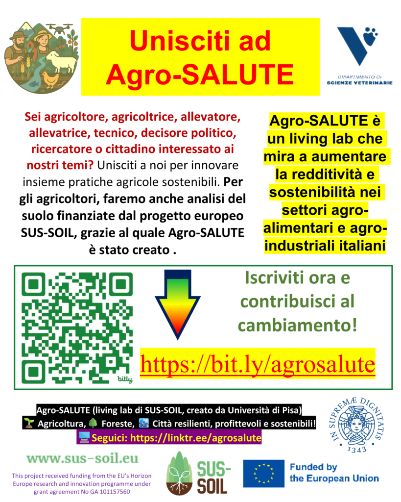 🌾 Sono aperte le adesioni al living lab #AgroSALUTE! 🌱 Insieme per un’agricoltura più sostenibile, resiliente e redditizia 🌍 Agro-SALUTE è il Living Lab nazionale nato al Dipartimento di Scienze Veterinarie di Pisa grazie al progetto europeo SUS SOIL. 📲 Unirsi Leggi tutto …